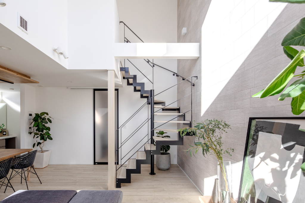 その想いを叶えるために、廻り階段をあえてスケルトンにし、視線の抜けを確保。