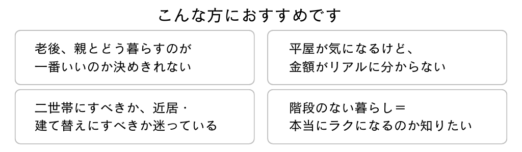 “親と暮らすかもしれない”“部屋を減らしてコンパクトに暮らしたい”など、将来の選択肢を残したい方に向いています。