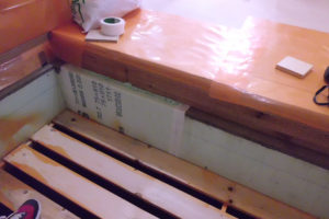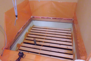 次に木材を組立ててスノコのような状態にします。これは湿気をうまく逃がす為の処置と、上に乗せる板状の断熱材の受材の役割があります。