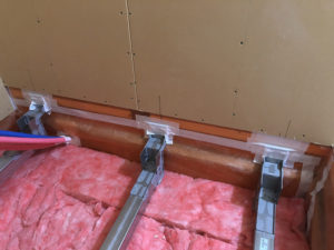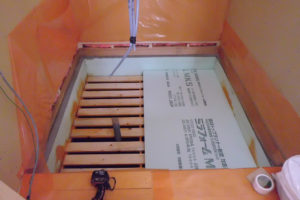 そしてその上に綿状の断熱材を乗せ、ユニットバスの架台を取付けてから気密テープで気密処理を行います。気密処理をしないと、せっかく断熱材を入れても冷気が下から上がってきてしまうので、