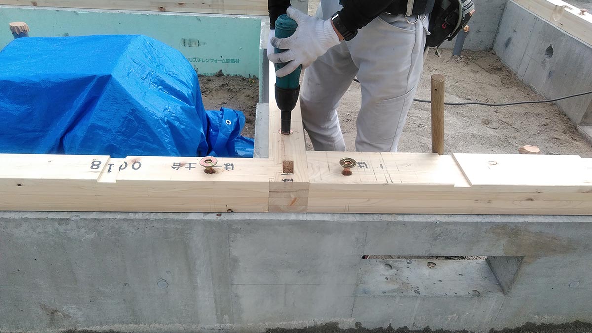 基礎完成後、基礎の上に土台を配置していきます。