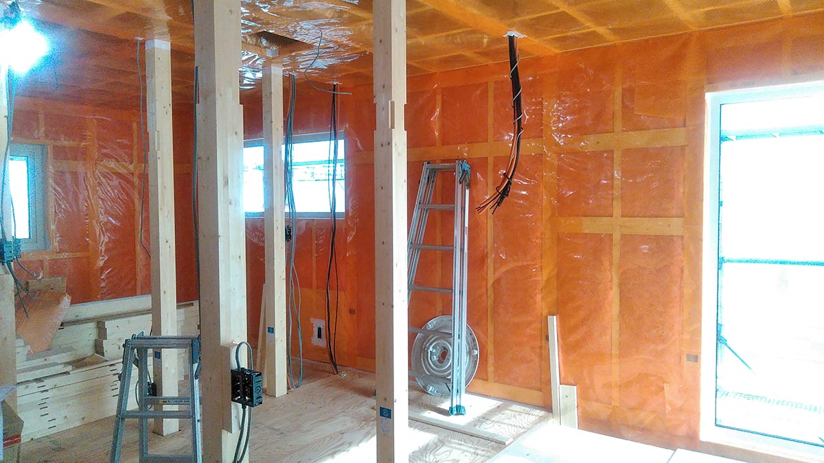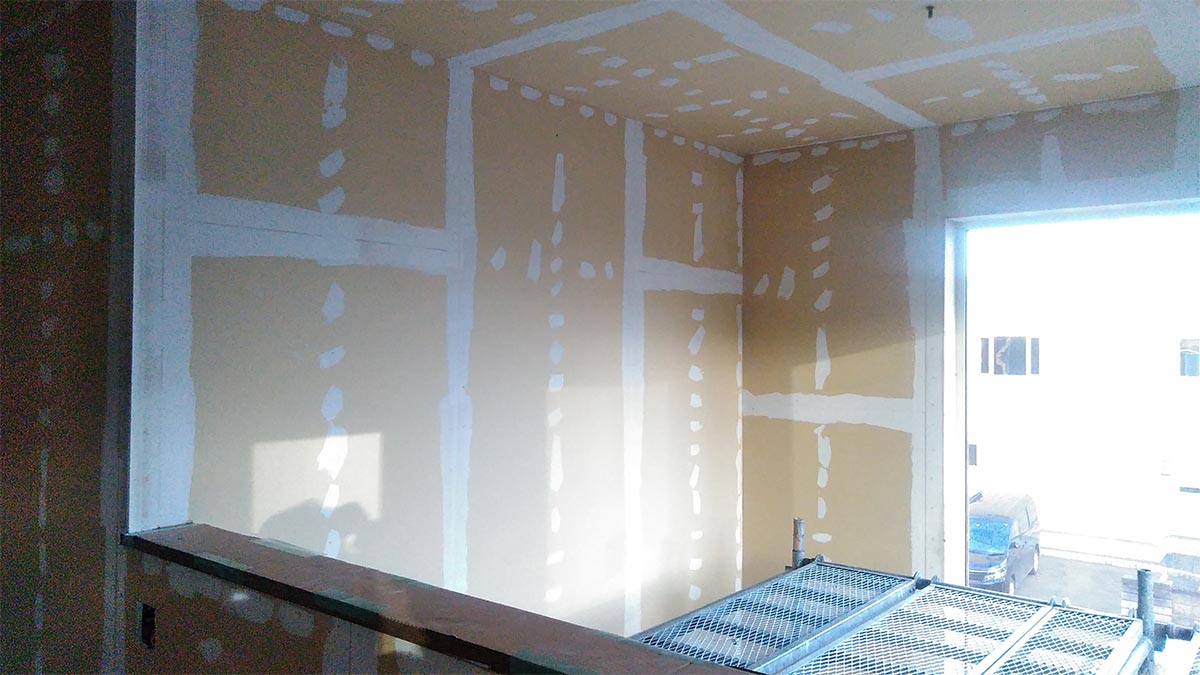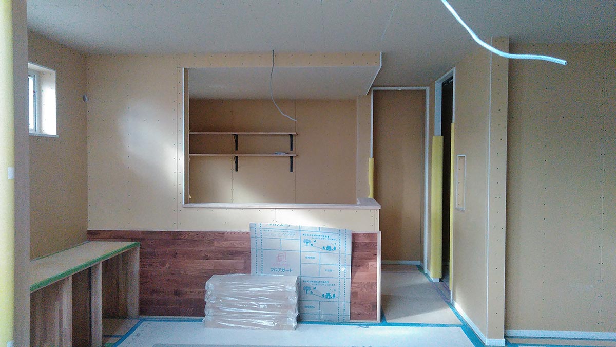 気密シートを張ったら、難燃性の石膏ボードを貼っていきます。