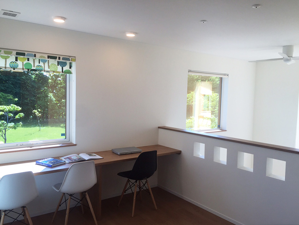 2階吹き抜け横にあるご主人や奥様の自分時間のスペースからも、青々とした緑地が眺められます
