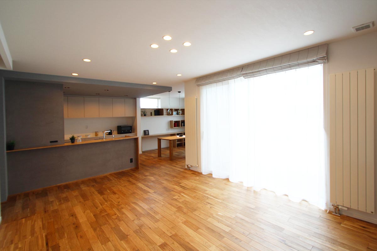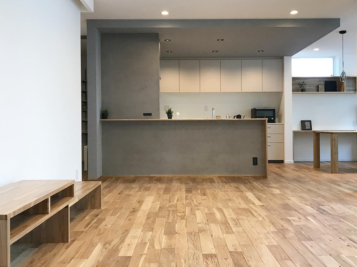 グレーと白の塗り壁と無垢床のリビングはユーティリティとキッチンに