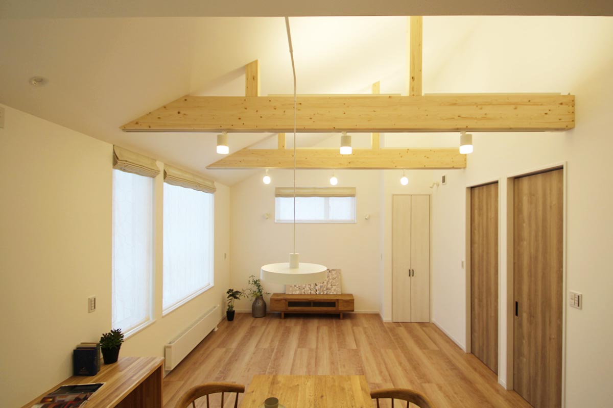 梁のある勾配天井が気持ちいい、塗壁と三角屋根のかわいい平屋の