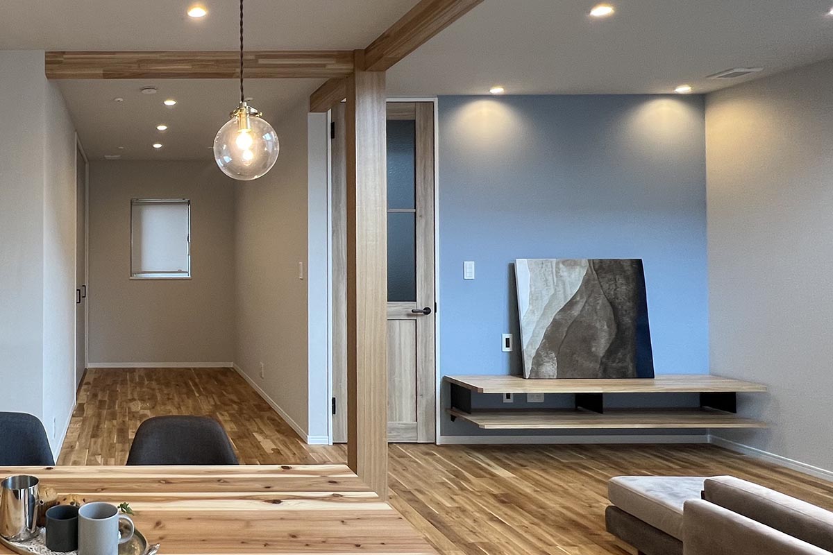 ブルーグレーだけだと寒々しい雰囲気になってしまいますが、化粧柱と化粧梁から感じられる木のぬくもりが空間をあたたかなものにしてくれています。