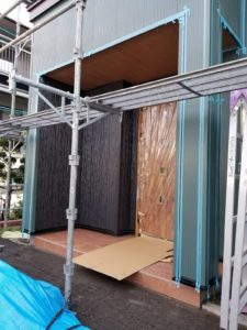 金属系サイディングの外壁が出来上がり、玄関ドアが入りました。