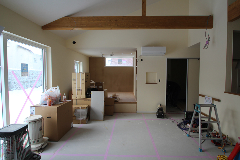 ▽現在のK様邸の様子。奥が小上がりの和室。勾配天井の広々としたリビングダイニング。完成が楽しみです。