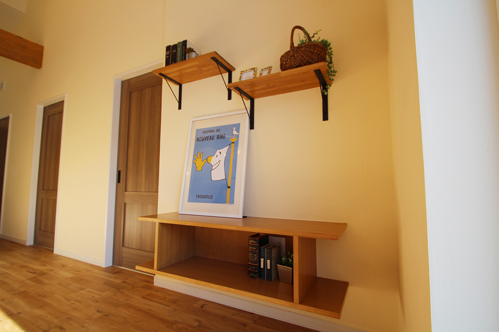 内装は、壁は塗り壁、床は無垢フローリング、勾配天井の木梁、造作のTVボードなど、木や自然素材を活かしたナチュラルテイストのインテリアでまとめられています。