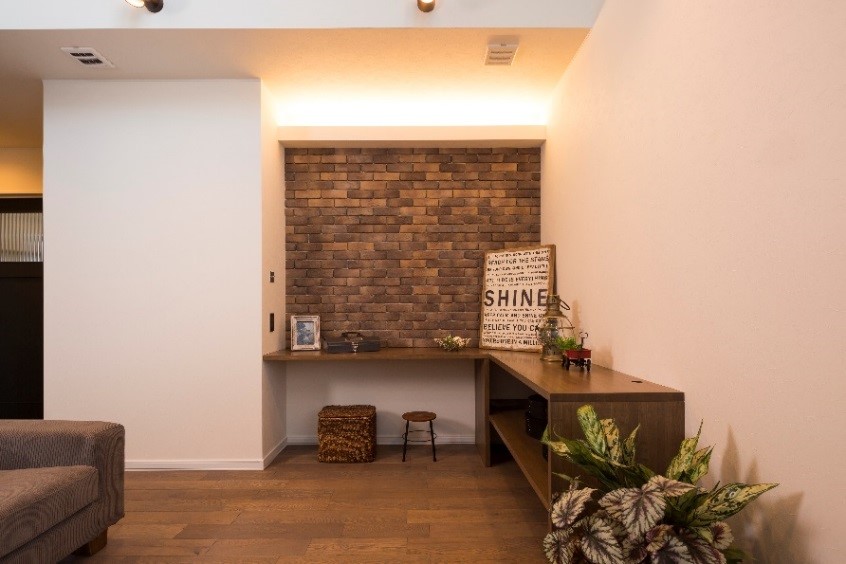 壁紙だけでなく、本当の木やタイルなどで仕上げると壁に凹凸が出て照明が当たるとよりいっそう引き立ってきます。