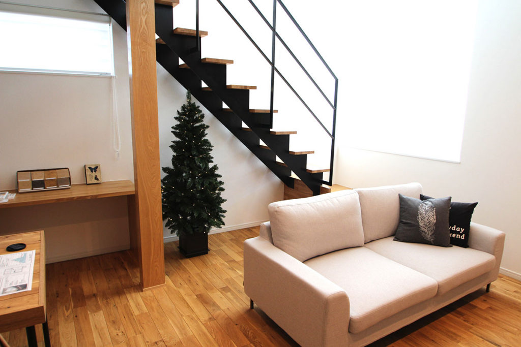リビング階段下のスペースを有効活用しクリスマスツリーを配置いたしました。