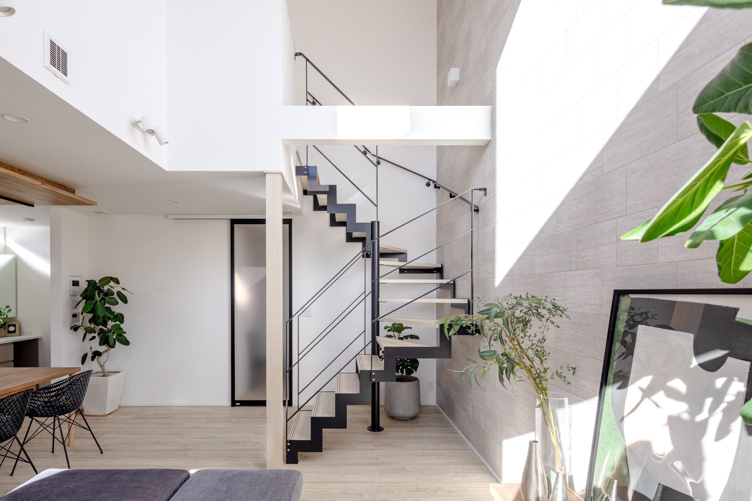 1階と2階を繋ぐ、階段は抜け感のあるアイアン素材を採用し、吹き抜けならではの解放感を引き立たせます。