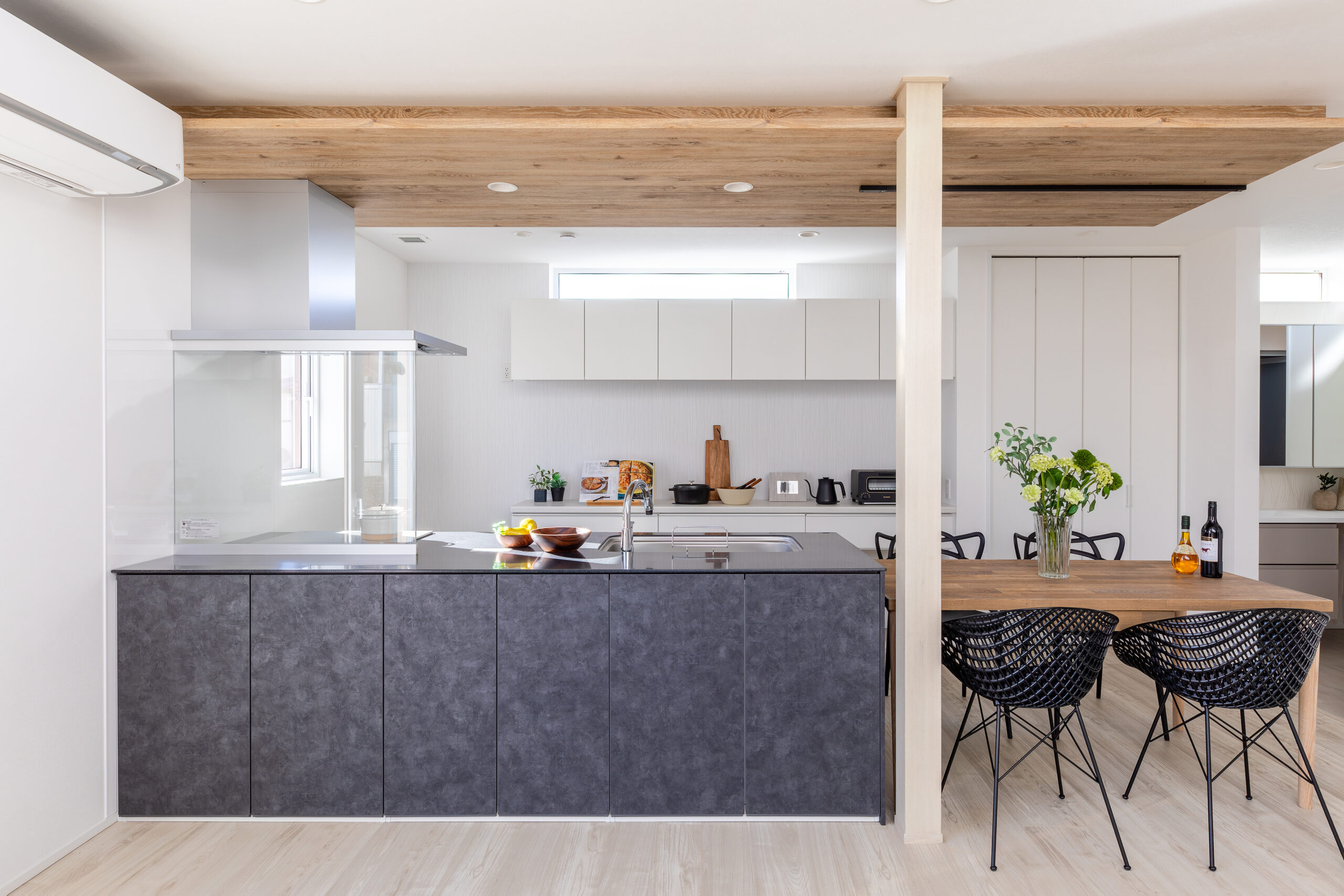 スタイリッシュな素材のキッチンと天井とダイニングに使用した木目が演出する、お洒落なダイニングキッチン。