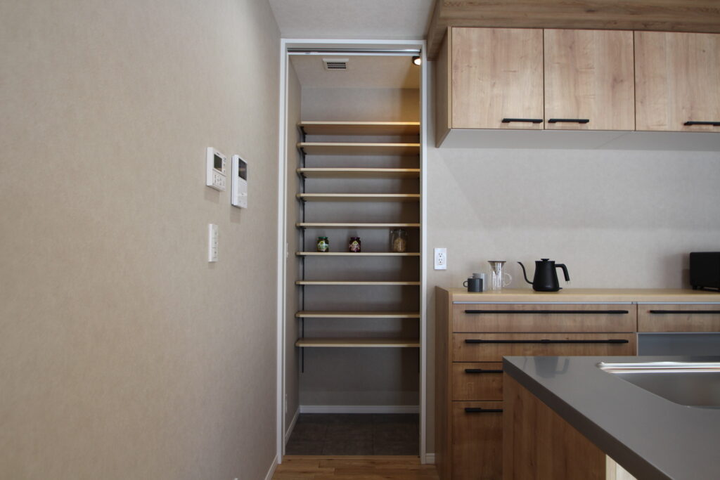 キッチンの背面には大容量収納のウォークインパントリーを設置し、忙しいご夫婦の“まとめ買い”を徹底サポートできる設計に。