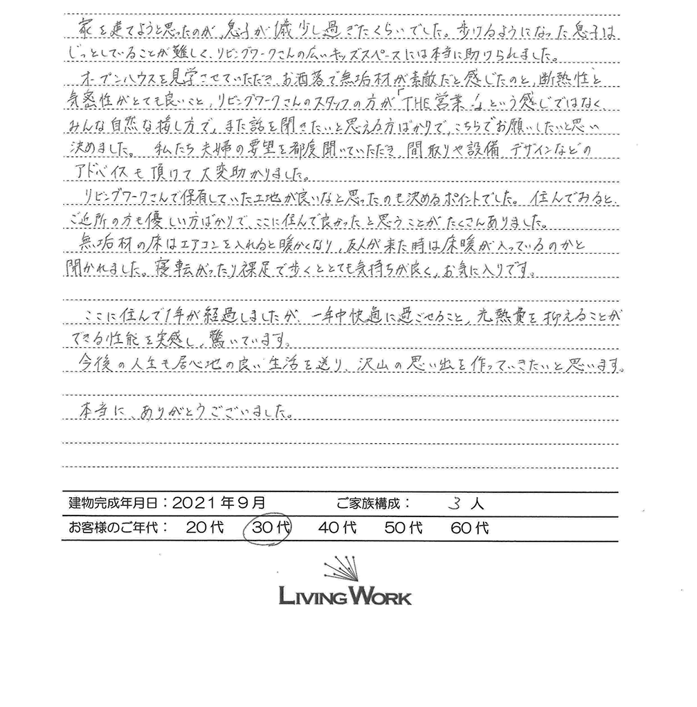 見学会に参加させていただき、お洒落で無垢材が素敵だと感じたのと、断熱性と気密性がとても良いこと、リビングワークさんのスタッフの方が「THE営業!」という感じではなく、みんな自然な接し方で、また話を聞きたいと思える方ばかりで、こちらでお願いしたいと決めました。