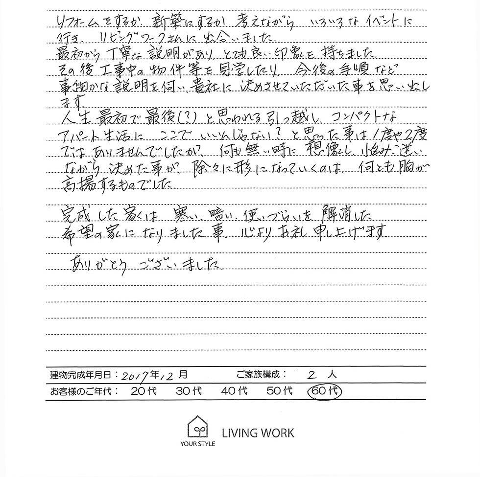 リフォームをするか、新築にするか考えながらいろいろなイベントに行き、リビングワークさんに出会いました。
