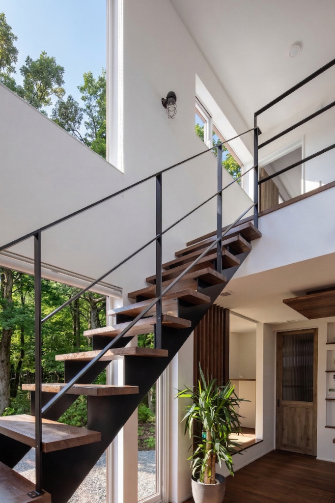 室内は大きな吹抜けとスケルトン階段で開放感を演出し、1階のファミクロやパントリーなど日常の使いやすさも両立。