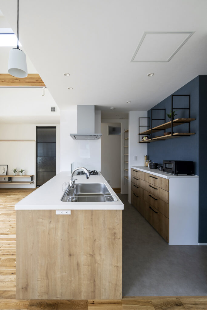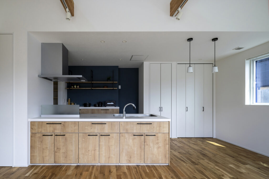 ペニンシュラキッチンで広いLDK、光が入ってきて明るい空間を作り上げました。