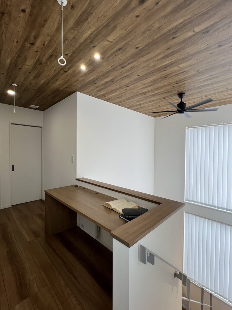 奥さまがリモートワークをしているというお施主さまは2階にある造作カウンターをリモートワークスペースに活用。