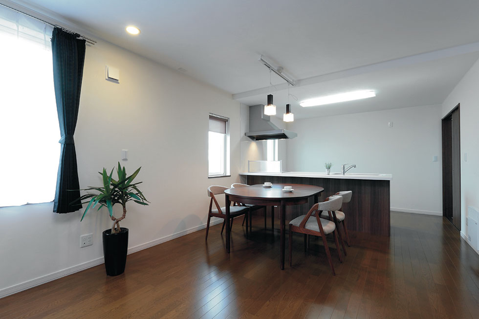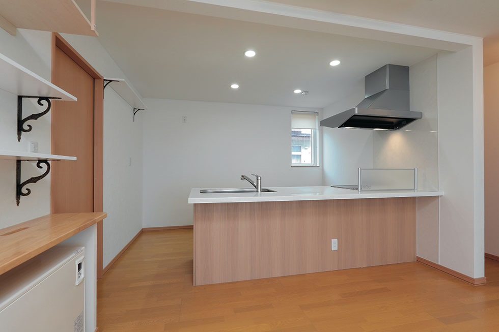 2階は、若世帯の居住スペース。奥さまの身長に合わせて設けたアイランドキッチンからは、ダイニングにリビング、さらにその先のフリールームまで見渡すことができ、お子さまの様子がよく分かります。ご希望のシーリングファンは天井を10cm高くして付けました。