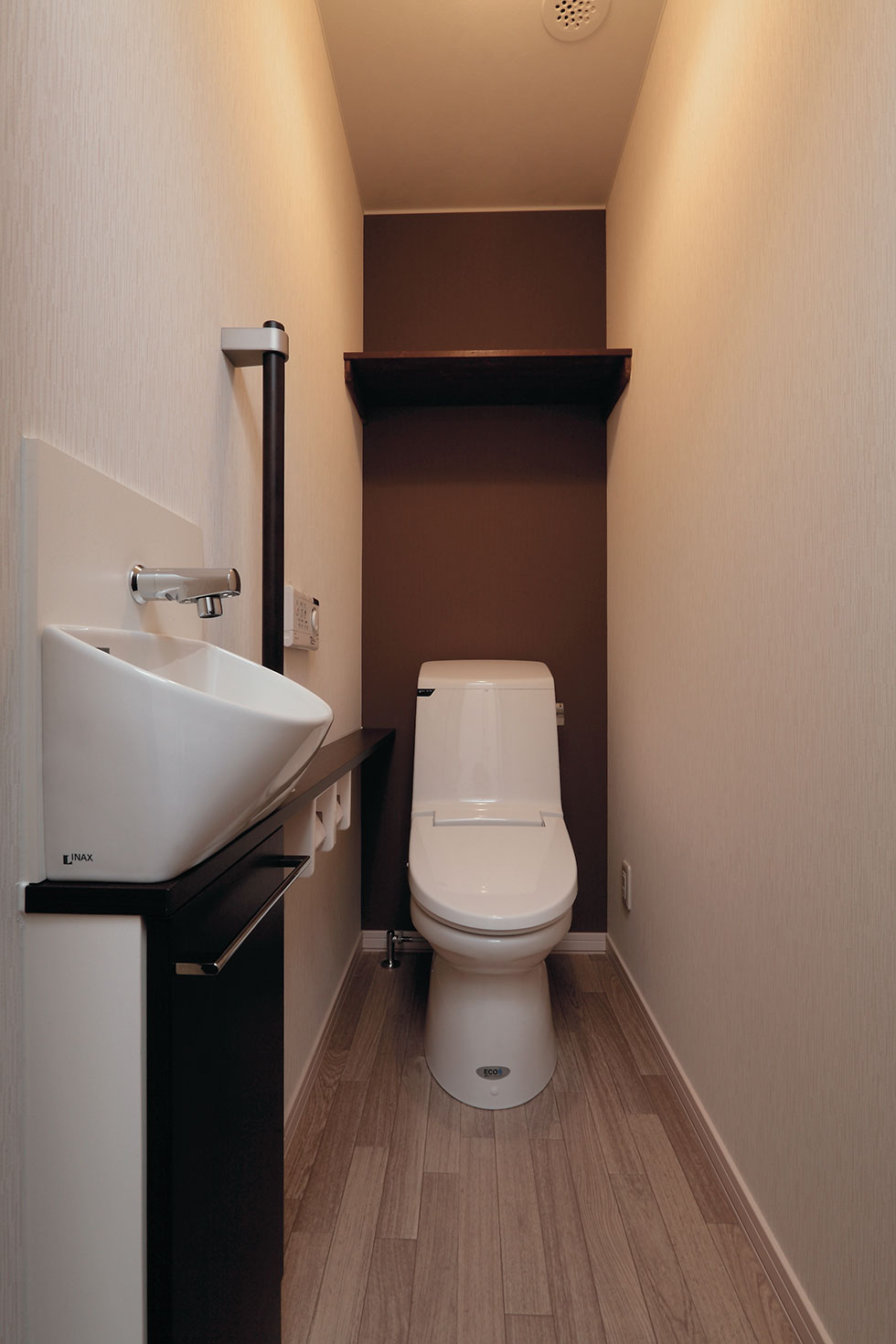 若世帯スペースのトイレは、リビングと同じアクセントカラーを配しました。親世帯のリビングにも同じカラーがアクセントで使われていて、引き締まった色がご家族のお気に入りです。