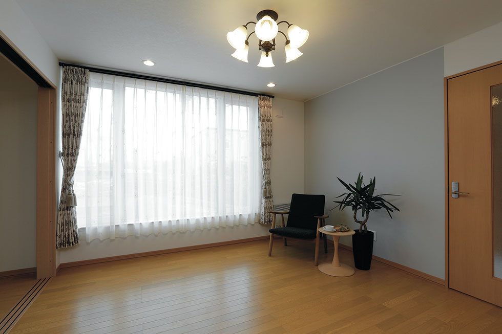 親世帯とお母さまの居住スペースとなる1階は、広々とのびやかな間取りを希望されました。リビングルームの窓は、大きさと位置を変えて設置したことで、より明るく開放的な空間に。