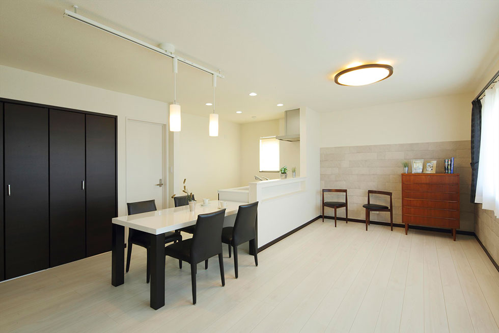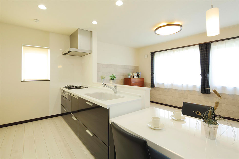 お子さま世帯の2階は、増改築で広々とした2LDKに。白を基調とした清潔感あふれるLDKには、奥さま念願の対面キッチンを設けました。その向かいは壁一面が開けたように感じる大きな窓を二枚設けて、家事をしながら外からの明るさと視界の広がりを感じられるようにしました。