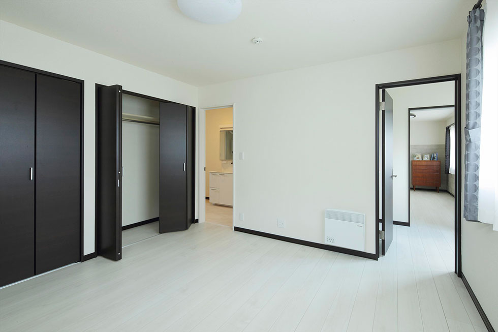 寝室にも二つの大きなクローゼットを確保。リビングとユーティリティースペース、両方につながるドアも設けたことで、スムーズに動ける回遊動線になっています。