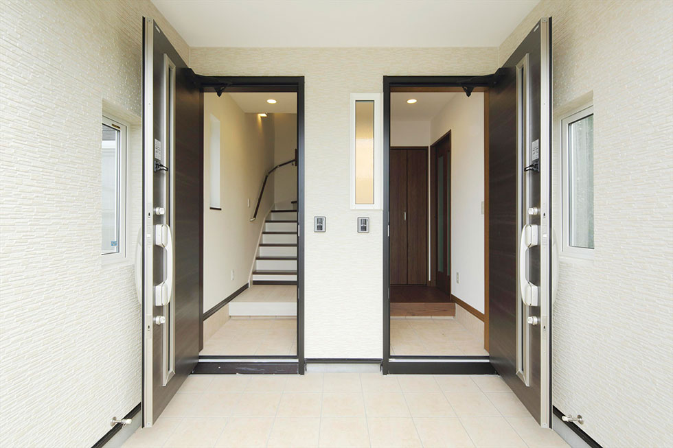 独立した二つの玄関。右側のドアはご両親側で、子世帯の階段下に当たるスペースを収納スペースとして活用しています。「生活リズムが違いますし、友だちを招くのも好きなので、お互い気兼ねをしないように暮らしたい」と独立型の二世帯住宅を希望していたO様。