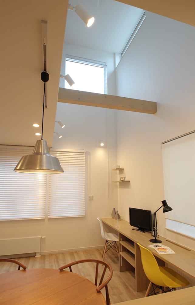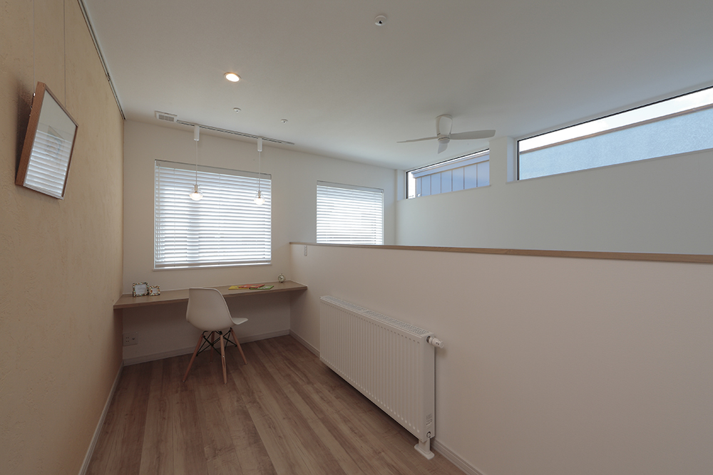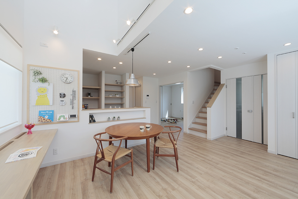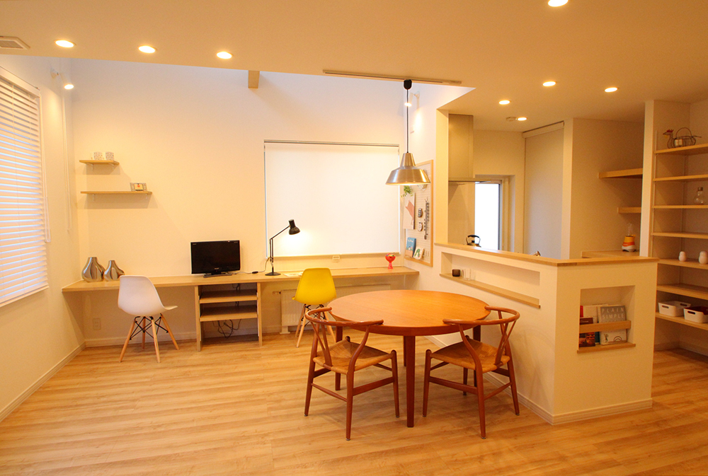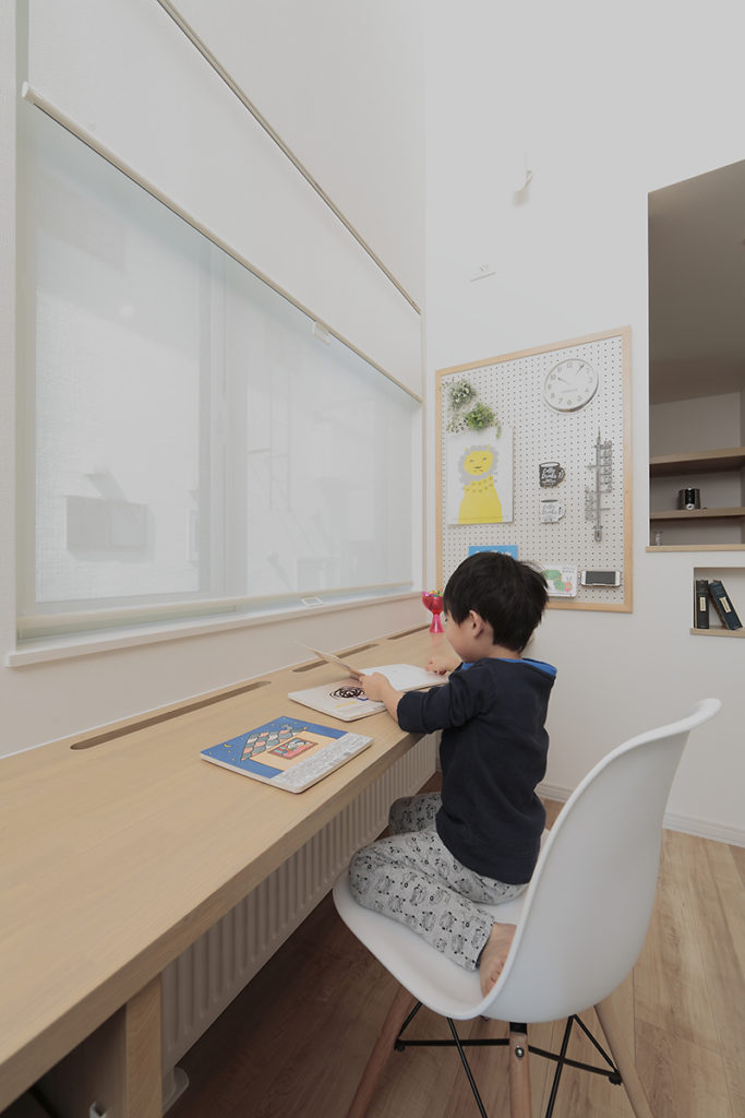 Sさまのご要望は、キッチンやリビングにいながら、子どもの様子やご両親の様子を感じられるようにしてほしい、とのことからキッチンの横にご両親の寝室を配置、リビングの一角に設けたスタディーコーナーは、お子さんがお絵かきや勉強をしている姿をキッチンやリビングからも見守れるようにしました。