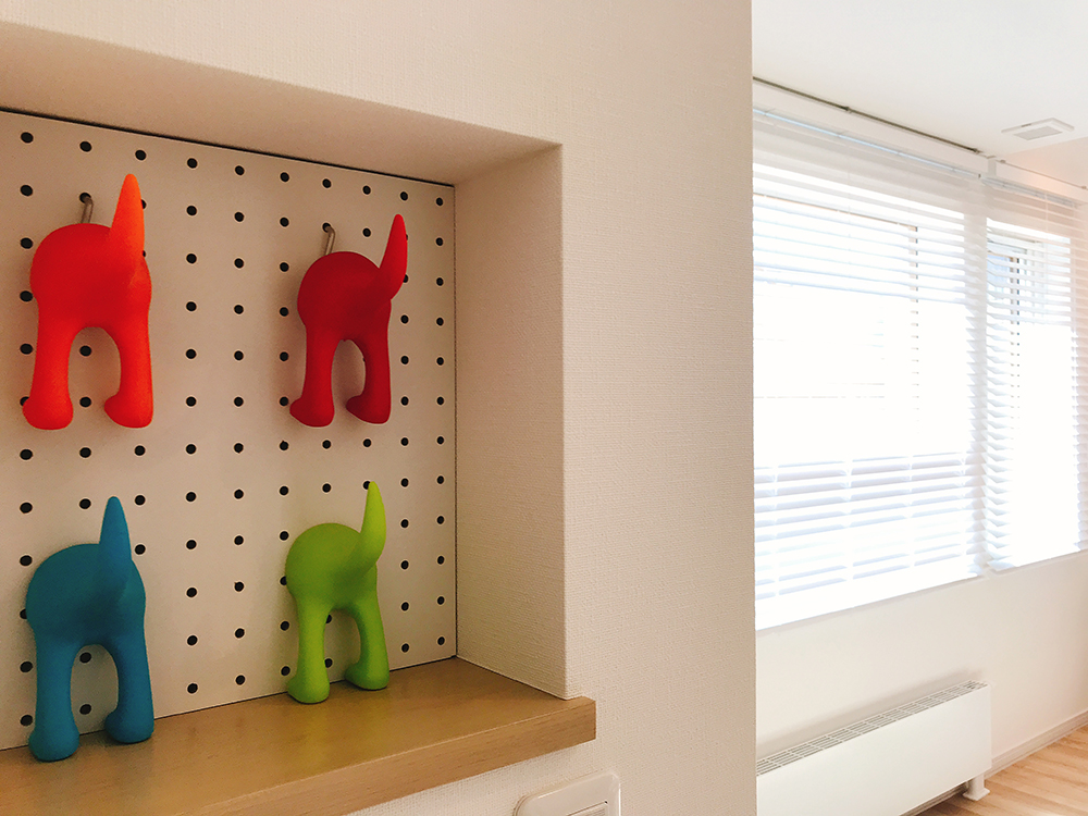 スタディーコーナーの壁面には、有孔ボード(ペグボード)があり、いつも読む絵本やお子さんが作った作品、携帯など、いろいろなものを飾れます。