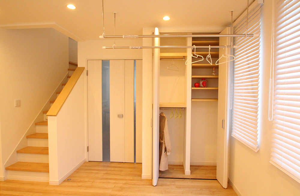 1階リビングに沢山干せる洗濯物干しコーナーを作ったのは、家づくりの先輩のお友達からのアドバイス。冬には、濡れたコートなども家族の人数分かけられます。とても役立っていて「作ってよかった!」と好評です。下の段はお子様用、上の段は大人用のコート掛けに。