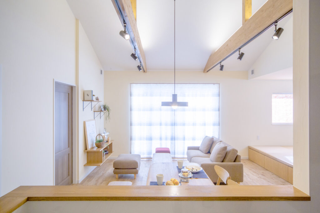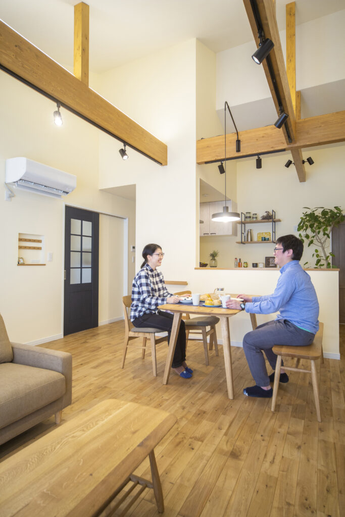 職場のご同僚がリビングワークで新築され、お住まいを見学する機会があり、ご夫婦そろって一目惚れ。天井の梁を表しにした伸びやかな住空間や、1台のエアコンだけで家中が暖まる省エネ構造を高く評価いただきました。