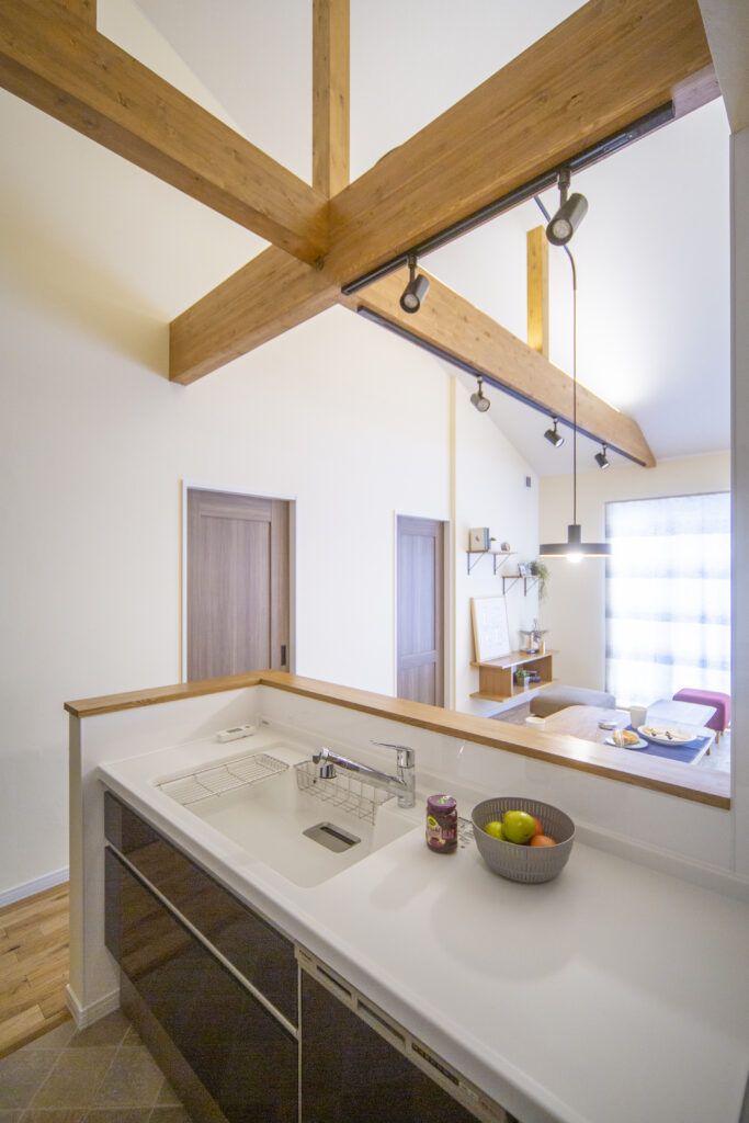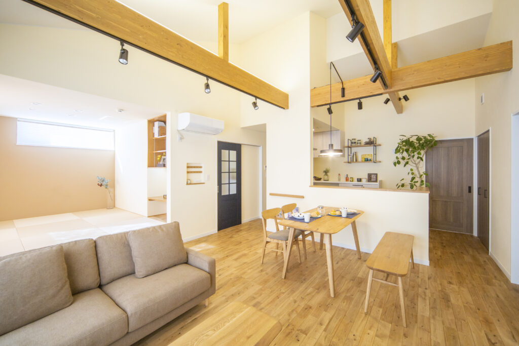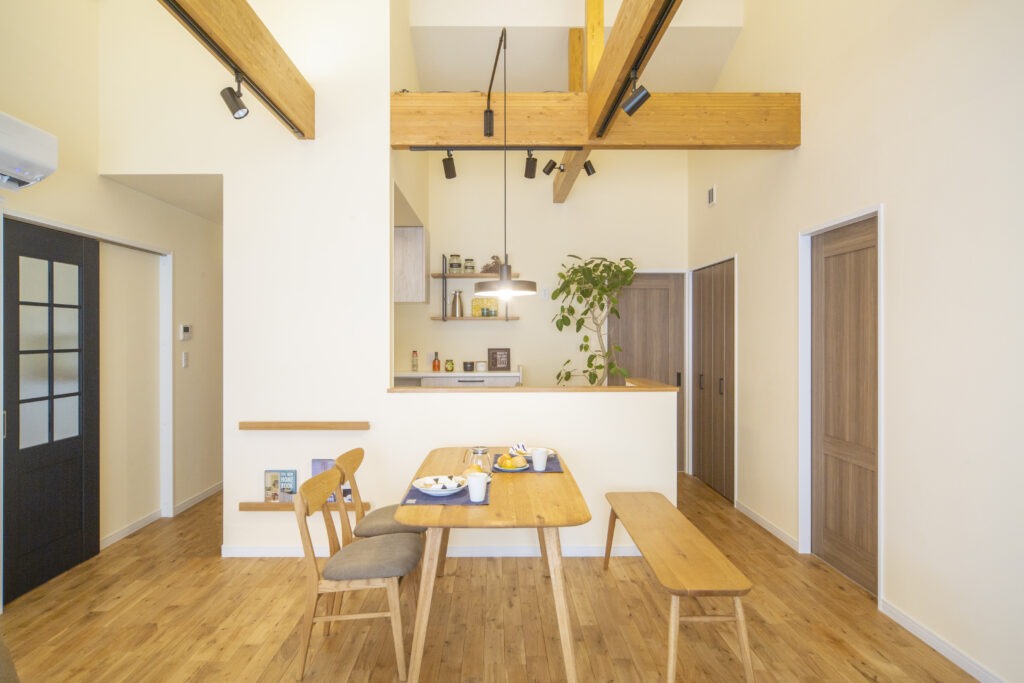 高い勾配天井と木梁のある、開放的であたたかな平屋住宅