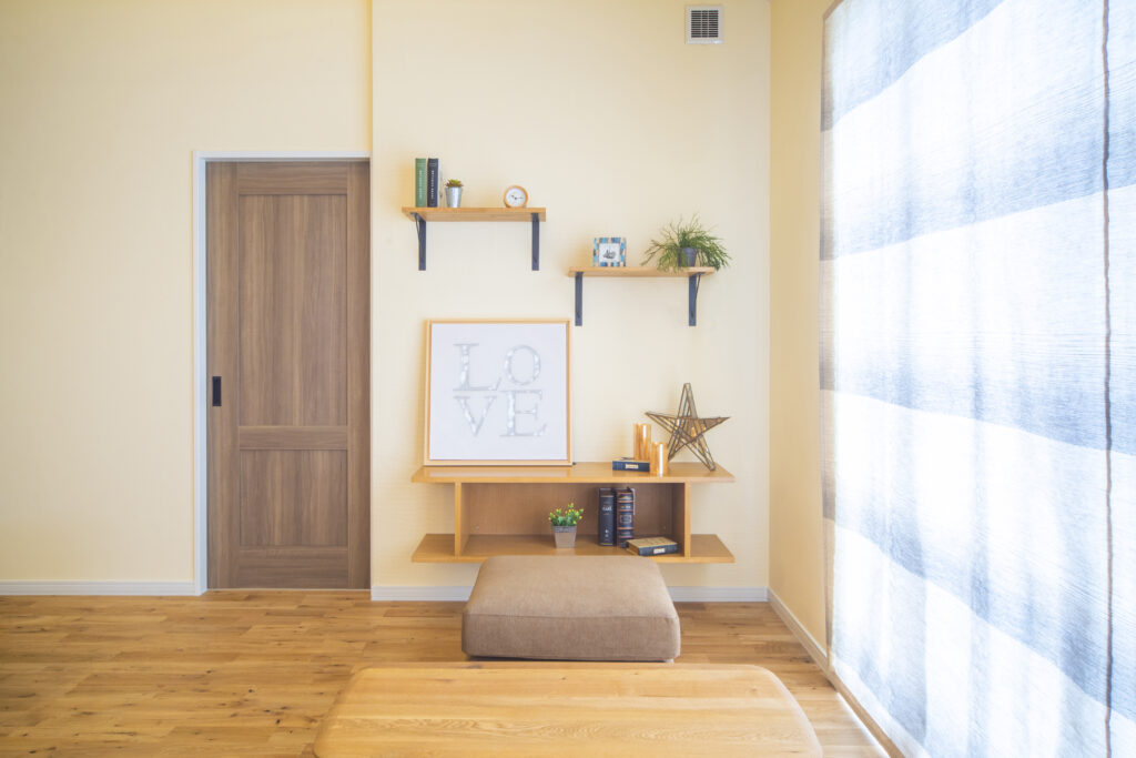 リビングに隣接するお部屋は引き戸が2か所ついていて、将来は仕切り壁を付けて個室にすることも可能です。蔵書を収められる可動式の本棚も造作。