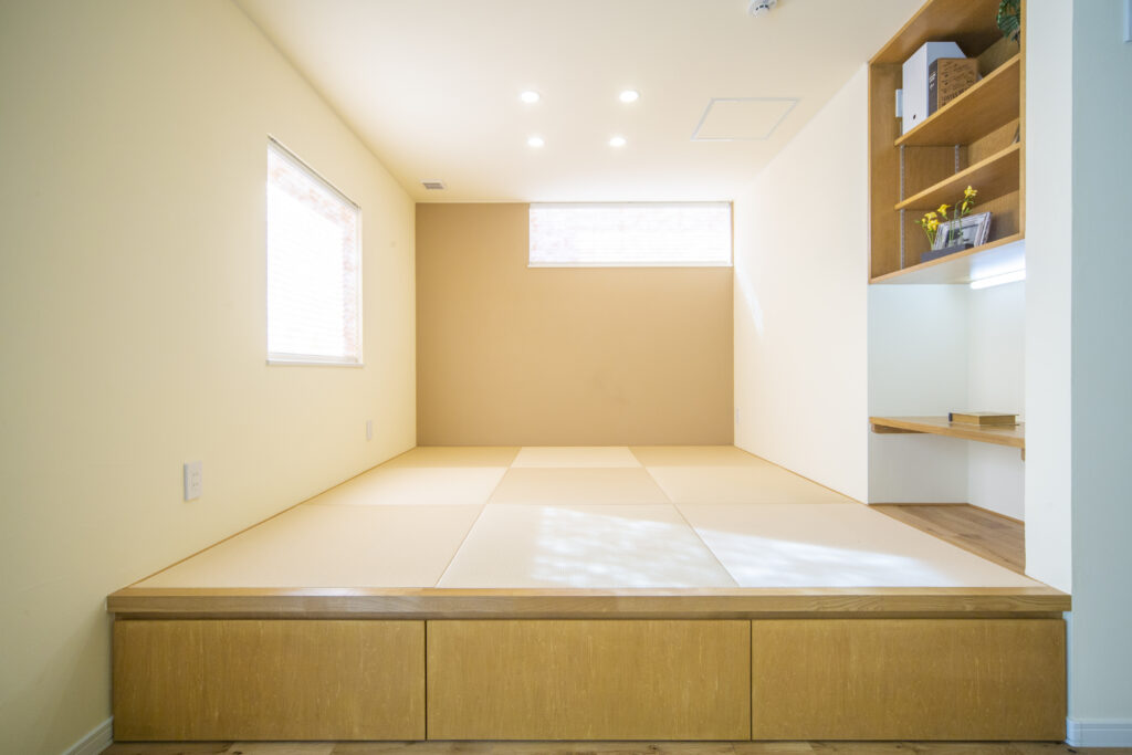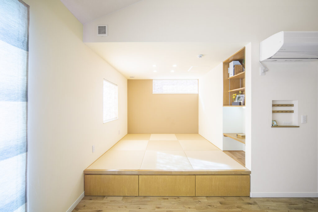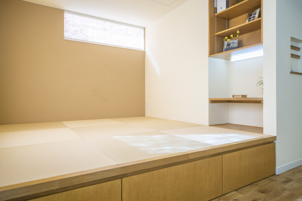 リビング横の小上がりは、ごろ寝ができるスペースがほしいというご主人と、パソコン作業を落ち着いてできるスペースが欲しいという奥さまのご希望が同時に叶った、ともにお気に入りいただいている空間です。畳の下はスライド式の大収納になっています。床からの高さを活かした床下収納は、収納力もたっぷりです。