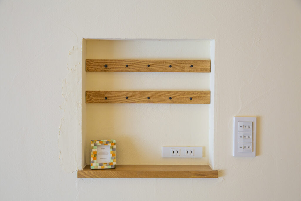 リビング・ドアと小上がりを結ぶ壁面には、キー・ニッチがあり、スマホの充電もできるよう、コンセントも設置しています。