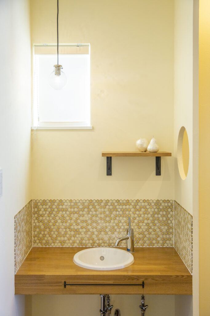 玄関ホールにはお手洗いを造作しています。玄関から見えないように設けた仕切り壁には丸窓をあしらい、六角形のタイルや丸いガラスのランプなど、奥さま好みの優しい雰囲気に仕上がりました。