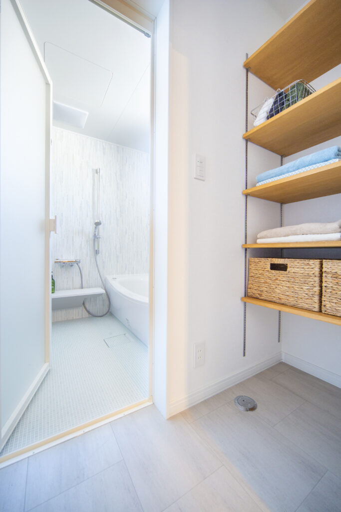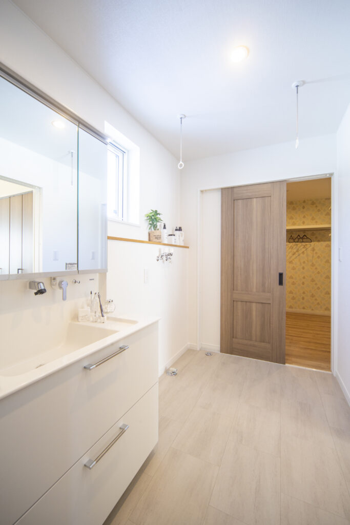 洗面・洗濯室の横には脱衣室があり、タオルや下着などを収める可動棚を設置。脱ぐ→洗う→干す→仕舞うという動線が一本で完結する時短動線とゆとりのある収納計画で、家事楽で快適な暮らしが実現しそう。