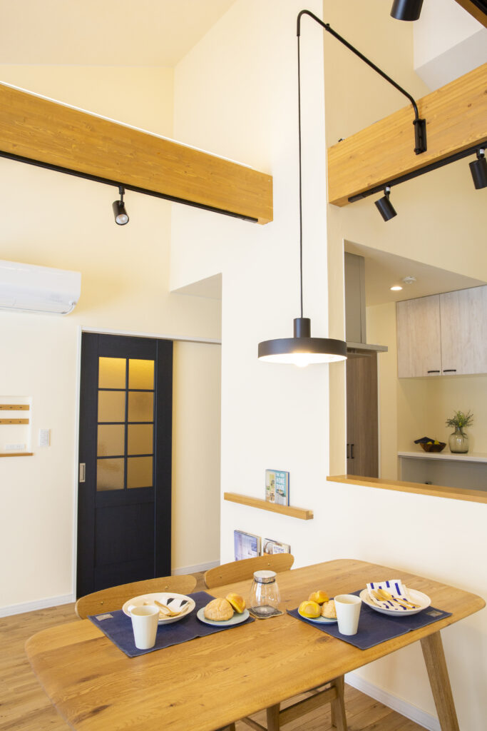 平屋・三角屋根の吹き抜けLDKと、共働きご夫婦にうれしい時短動線の家(北広島市)