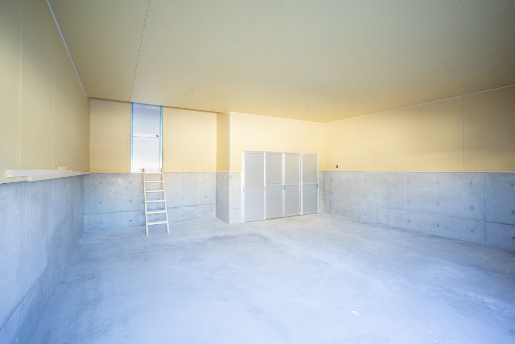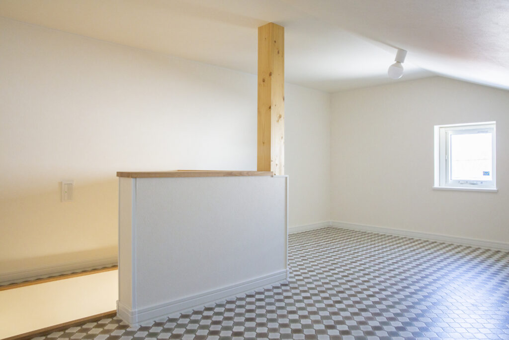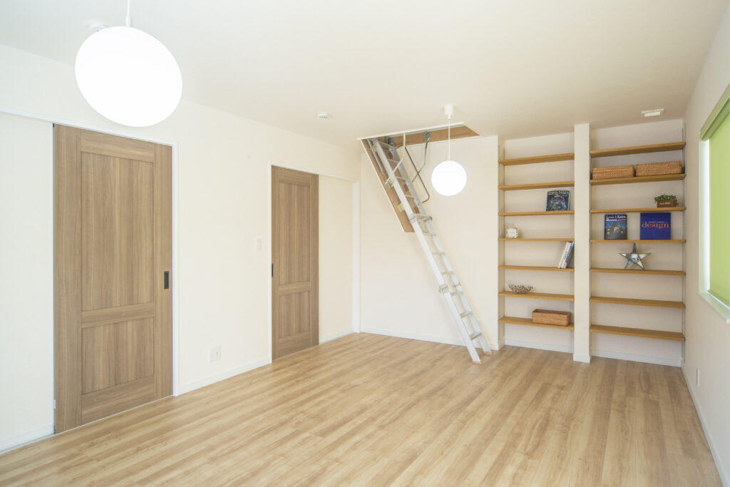 屋根裏収納のついた個室は、将来的には仕切り壁を付けて子供部屋にも