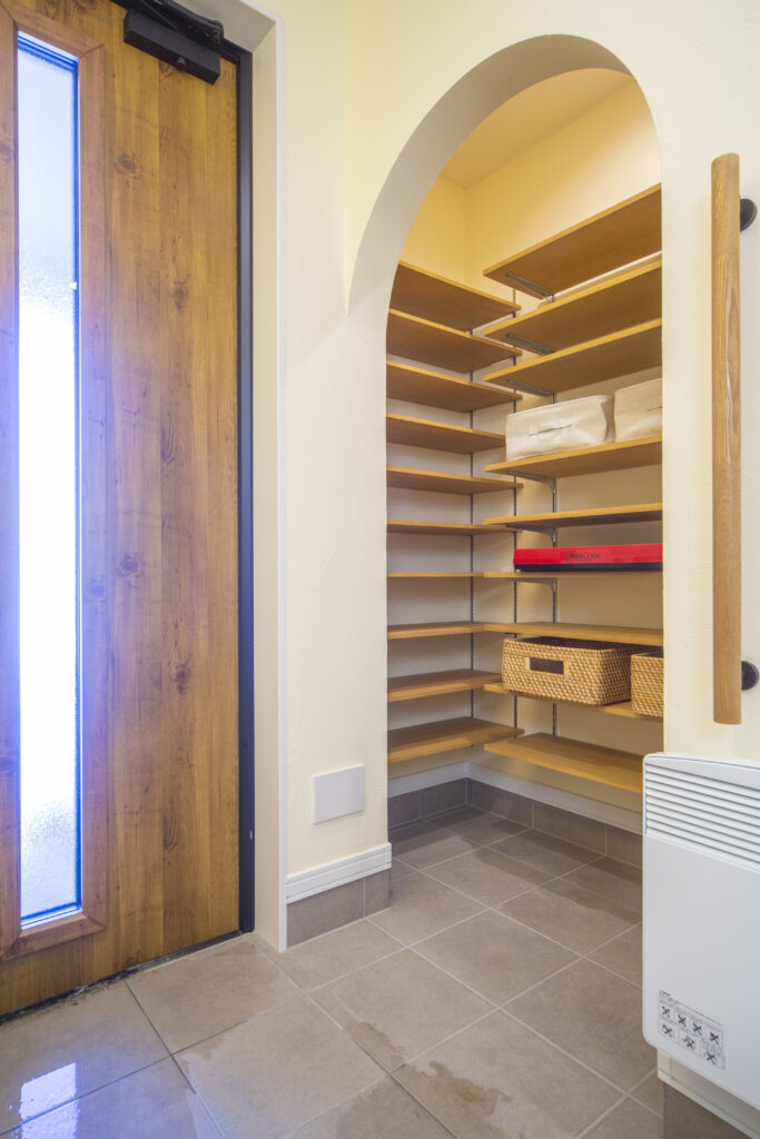 シューズ・クロゼットの出入り口はアールの下がり壁に。