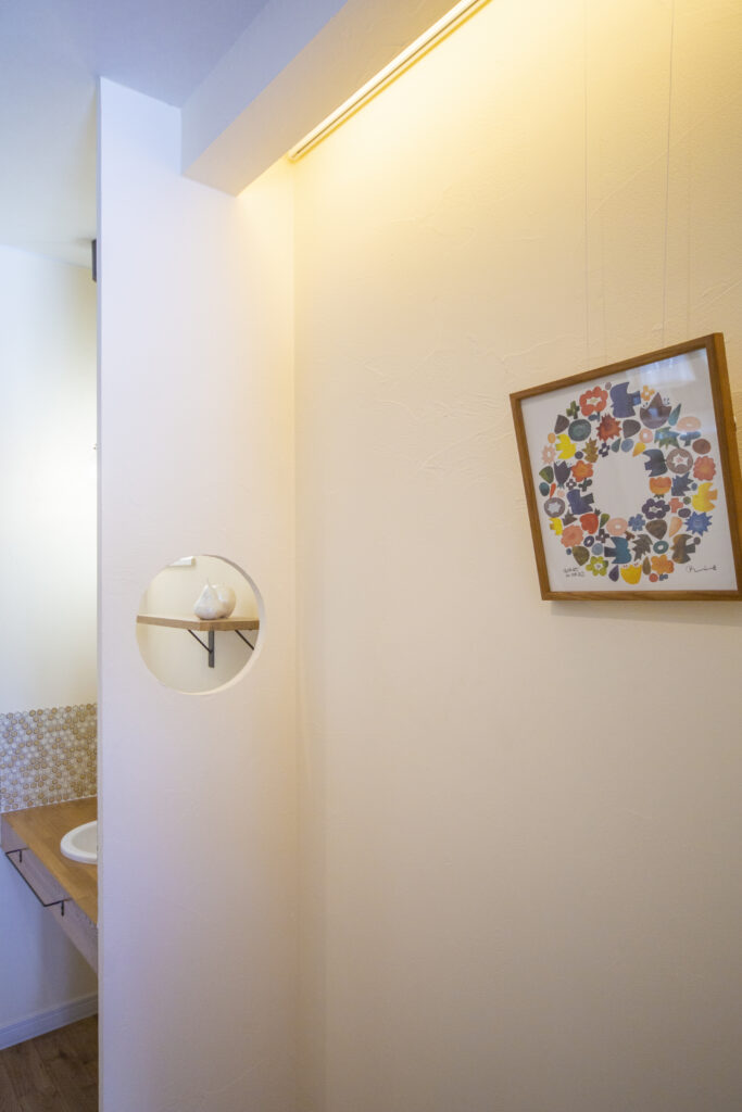 玄関には間接照明付きのピクチャー・レールも。手洗いは仕切り壁で丁度よく隠れていて、丸窓から可愛らしい小棚が見えています。