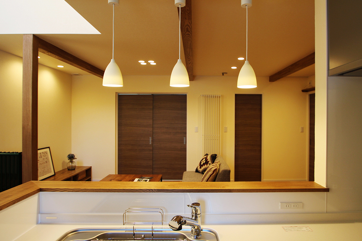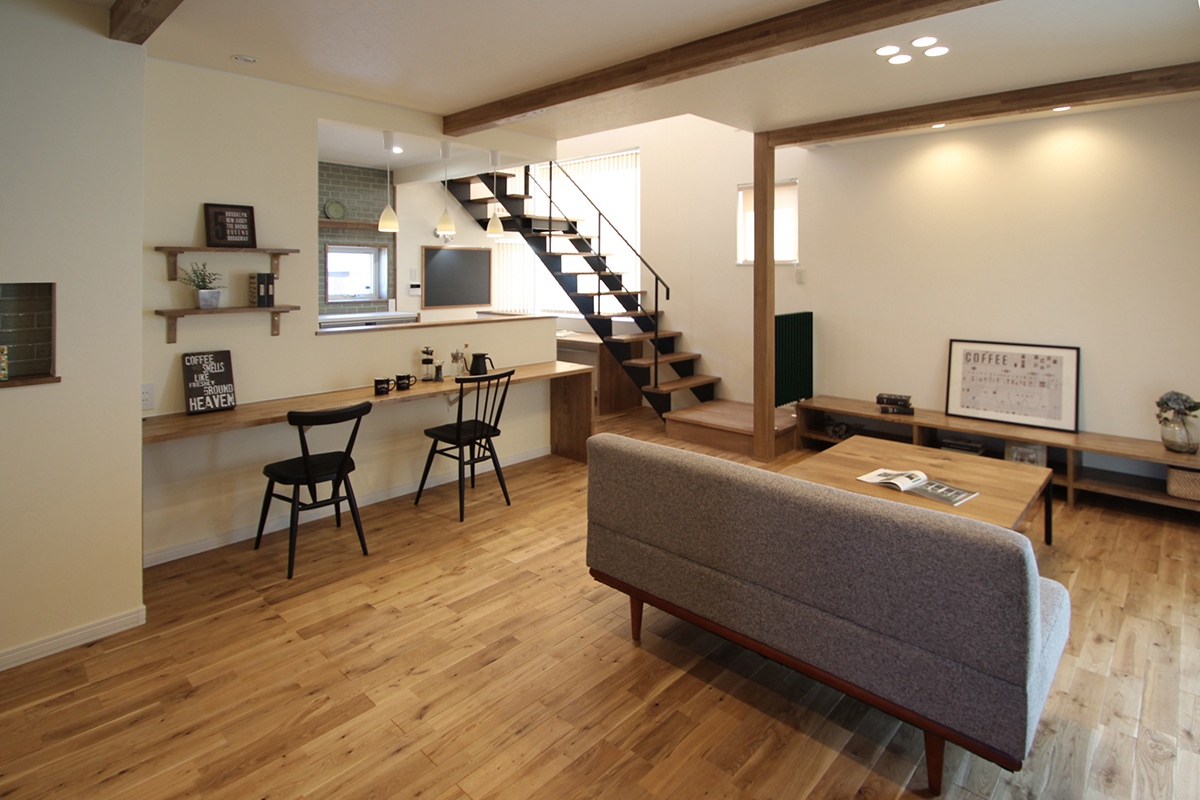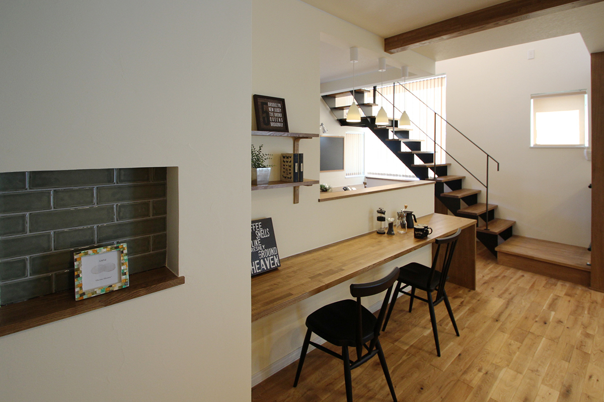 無垢フローリングや造作のカウンターテーブル・TVボード、天井の梁などの木をこげ茶で統一し、深いグリーンのタイルをキッチン背面やニッチに使いアクセントに。キッチン前カウンターで食事をされるKさまご家族、なので、ダイニングテーブルはありません。