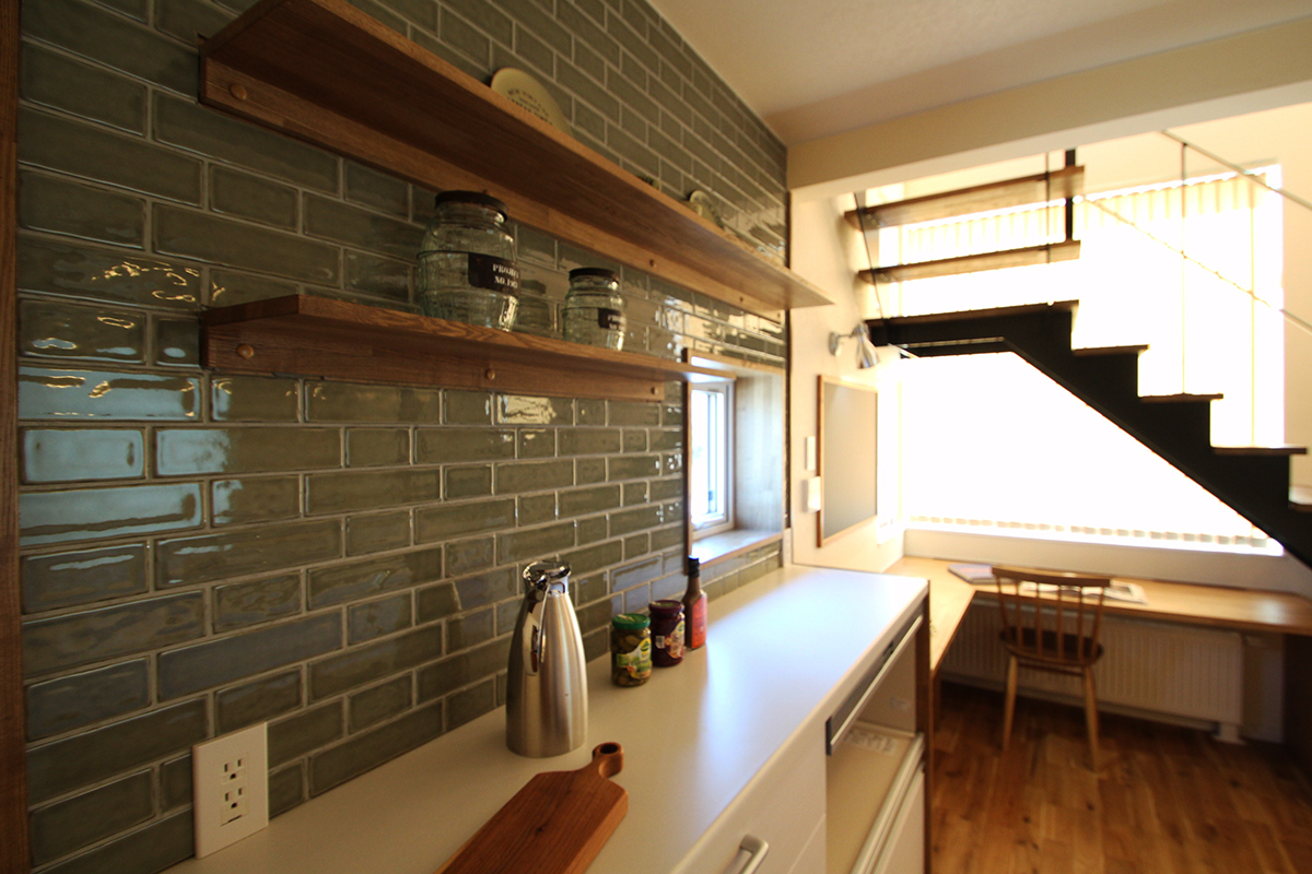 キッチン背面はグリーンのタイルでやわらかな雰囲気に。飾り棚は見せる収納として活躍。キッチンの横には1.5畳のパントリーがあり、食品など、大容量に収納できます。