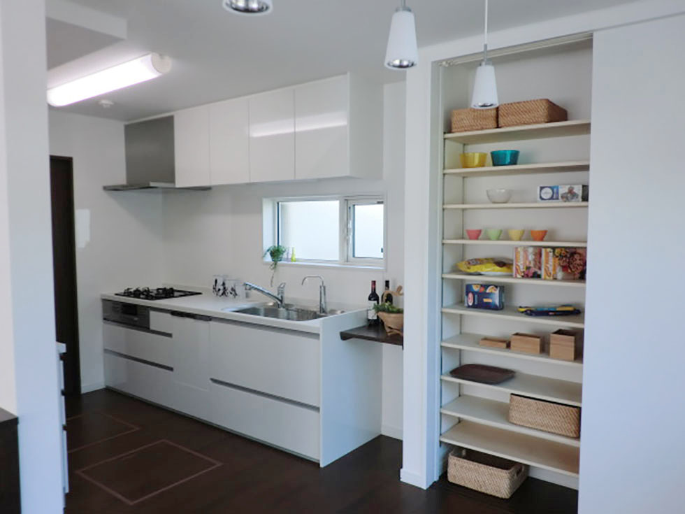 大容量パントリーのある明るいキッチンは使いやすいと奥さまに好評です。カウンターのすぐ向かい側にも収納や棚を設置したので動きやすく、いつでもキッチンをスマートに保っておくことができます。