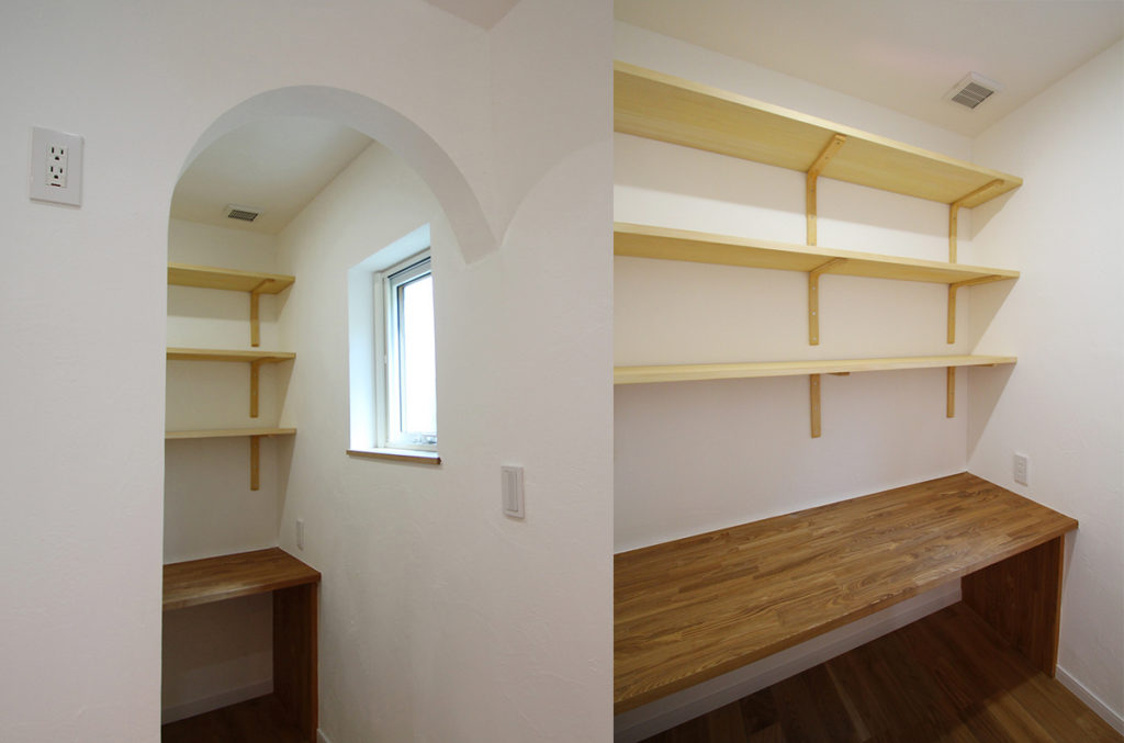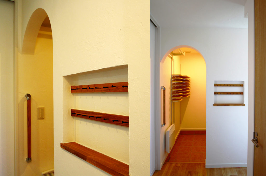 来客用と家族用に分けられる玄関には、大容量のシューズクローク。パントリー(食品庫)の中には、一定の涼しさを保つので野菜などの貯蔵に適した冷暗収納庫もあります(リビングワークで施工する高断熱・高気密のお家は、家中冬もとても暖かいので、玄関近くの部屋に野菜を置いてもすぐ腐るため、お客様には好評の収納庫です)。