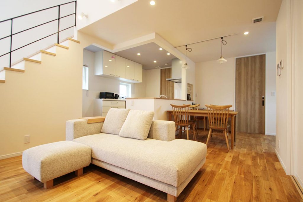 無垢床が温もりを感じさせてくれるリビングダイニングは統一感があって心地いい家族の団らんの場となっています。