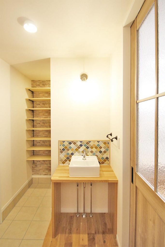 玄関ホールにはコラベルタイルがアクセントの造作手洗いを設置。帰宅してすぐの手洗いとして使えます。トイレを玄関近くに配置することで、トイレ内の手洗い器をなくすことができるメリットも。