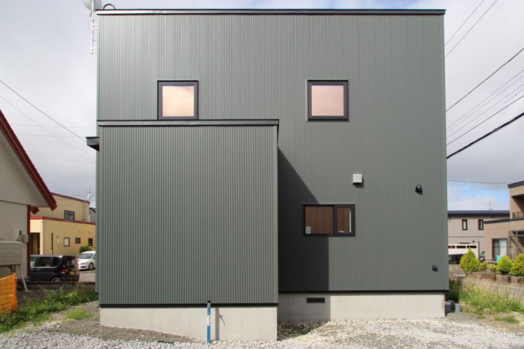 シンプルなガルバリウム鋼板張りの外観。玄関ポーチには外からの視線を遮断する仕切り壁。